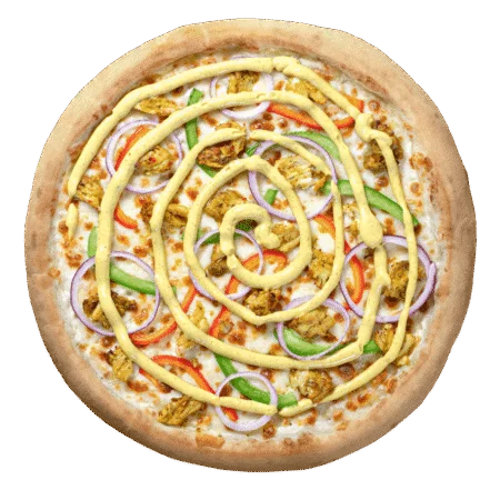 Crème fraîche, fromage, sauce carry, poivrons, oignons, poulet épicé