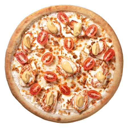 Sauce Tomate, crème de moutarde, poulet rôti, emmental, tomates, oignons frits, tomates cerise.