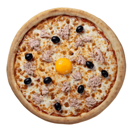Sauce tomate, fromage, thon, œuf, olives